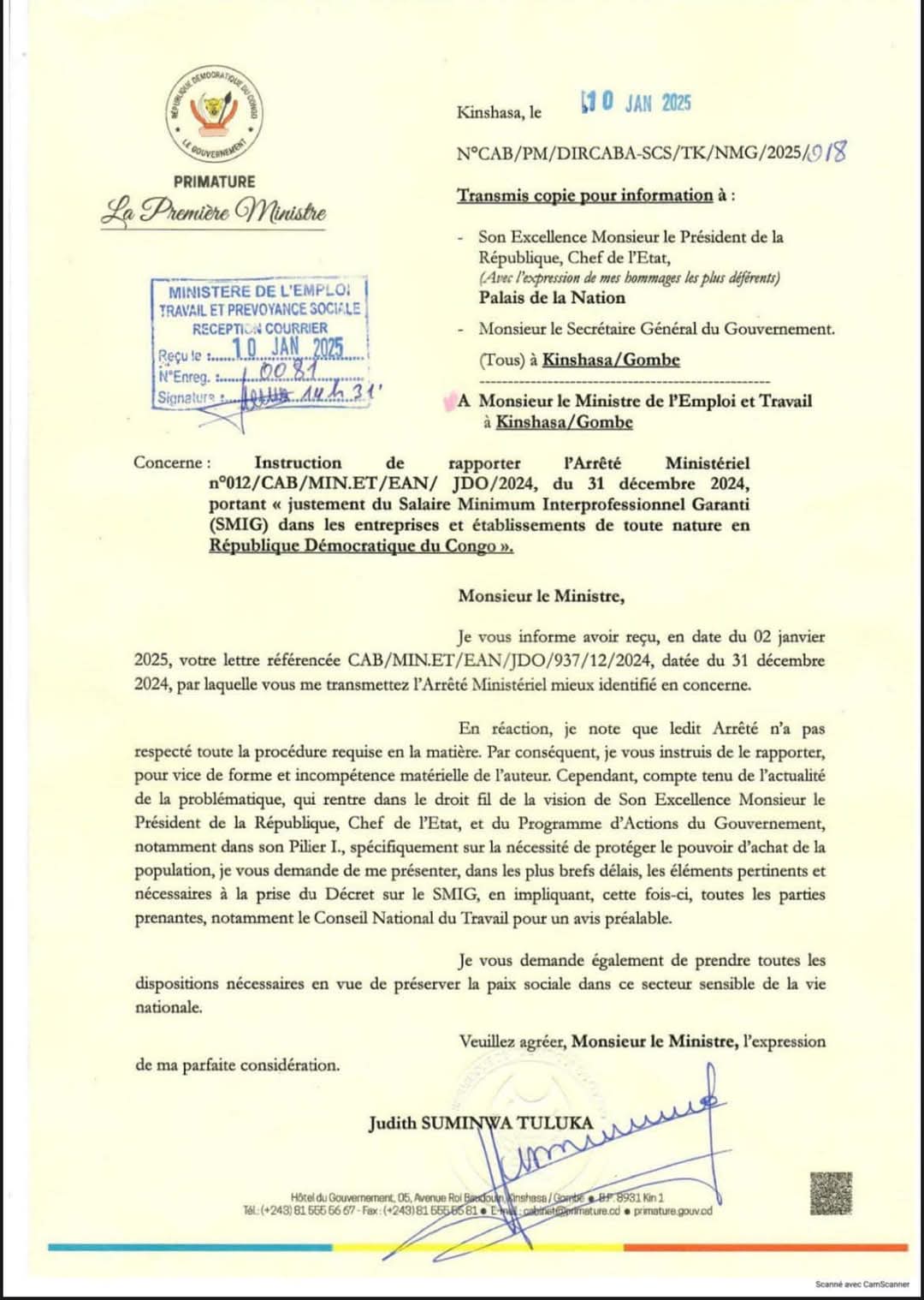 Dans une correspondance adressée au ministre de l’Emploi et Travail, la Première ministre de la République démocratique du Congo, Judith Suminwa Tuluka, a ordonné l’annulation de l’Arrêté Ministériel n°012/CAB/MIN.ET/EAN/JDO/2024 du 31 décembre 2024. Cet arrêté portait sur l’ajustement du Salaire Minimum Interprofessionnel Garanti (SMIG) dans les entreprises et établissements à travers le pays.