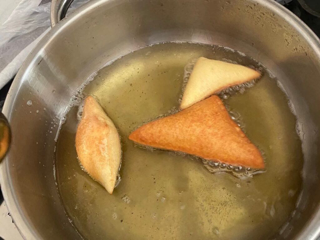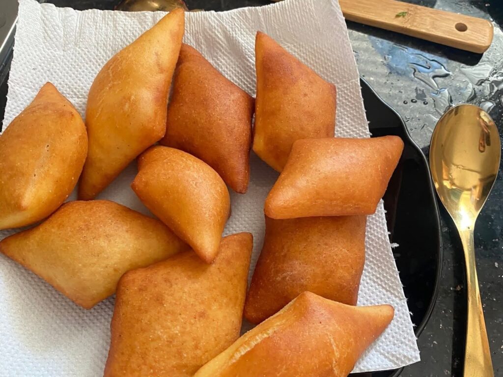 Mélangez d’abord tous les ingrédients secs. Ajoutez l’œuf, la levure préalablement activée dans l’eau tiède, puis incorporez la margarine. Mélangez jusqu’à obtention d’une pâte homogène. Laissez reposer 20 minutes sous un torchon. Façonnez ensuite en boules, recouvrez et laissez lever encore 10 minutes. Faites frire dans une huile chaude à feu moyen jusqu’à obtenir une belle coloration dorée.