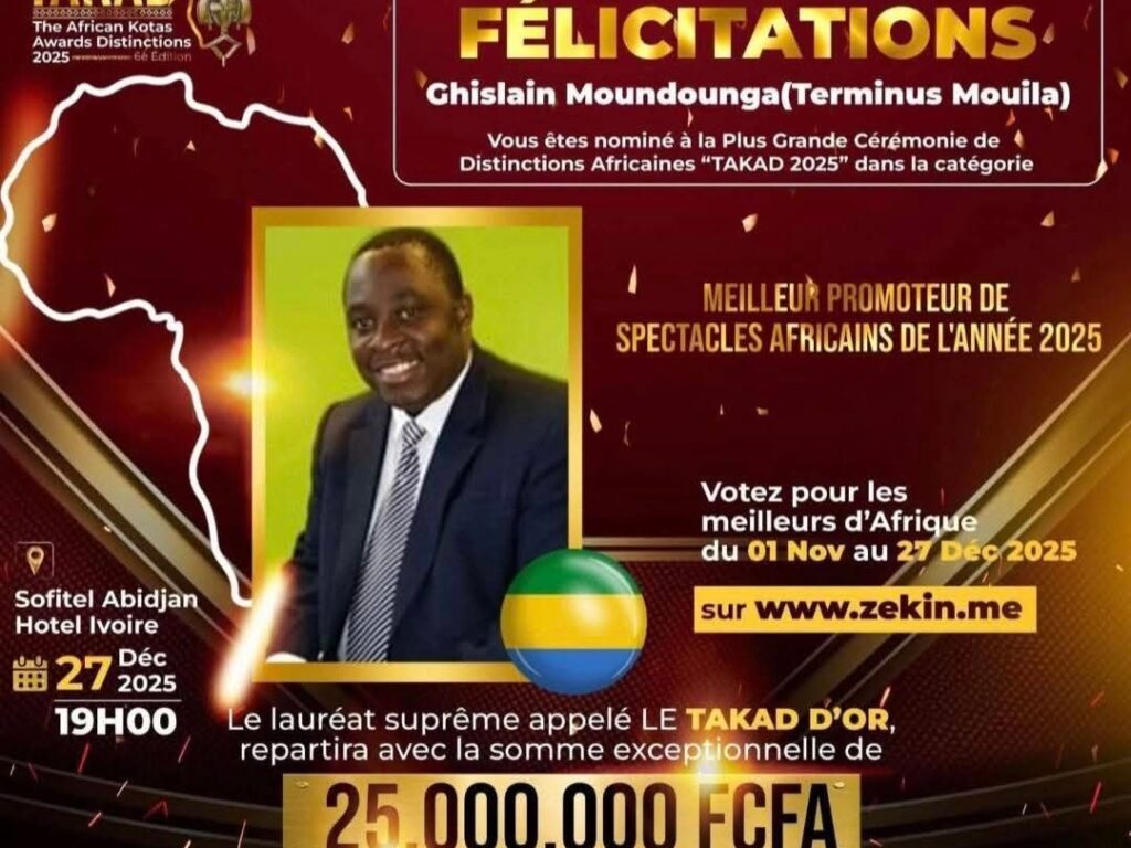 La culture gabonaise s’illustre une nouvelle fois sur la scène continentale. Ghislain Moundounga, promoteur culturel emblématique et figure centrale de l’événementiel au Gabon, vient d’être nommé pour l’édition 2025 des The African Kotas Awards Distinctions (TAKAD) dans la prestigieuse catégorie Meilleur promoteur de spectacles africains. Une distinction qui consacre son influence, son audace et l’impact retentissant du Terminus Mouila, devenu un véritable pôle culturel.