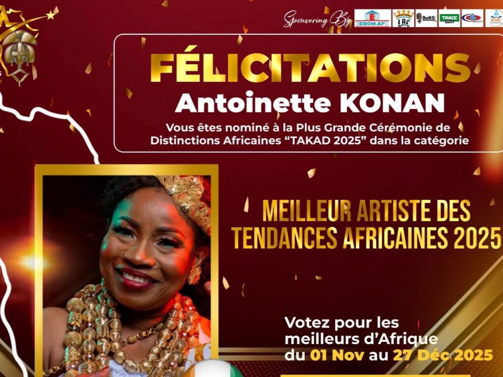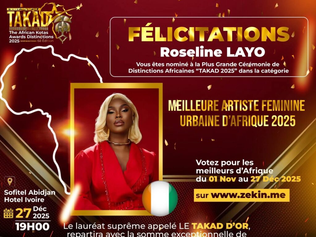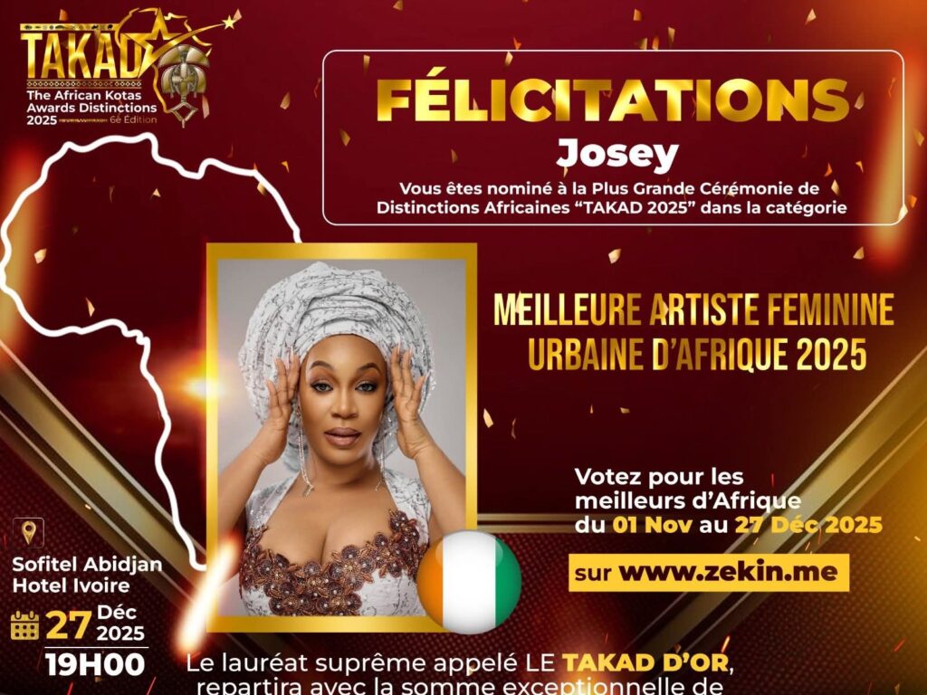 Le rendez-vous est pris pour le 27 décembre 2025 à Abidjan, où se tiendra la grande cérémonie des TAKAD, un événement qui rassemblera les acteurs les plus influents du divertissement africain. Une occasion unique de célébrer les talents qui font vibrer le continent et d’honorer le travail acharné des promoteurs culturels.