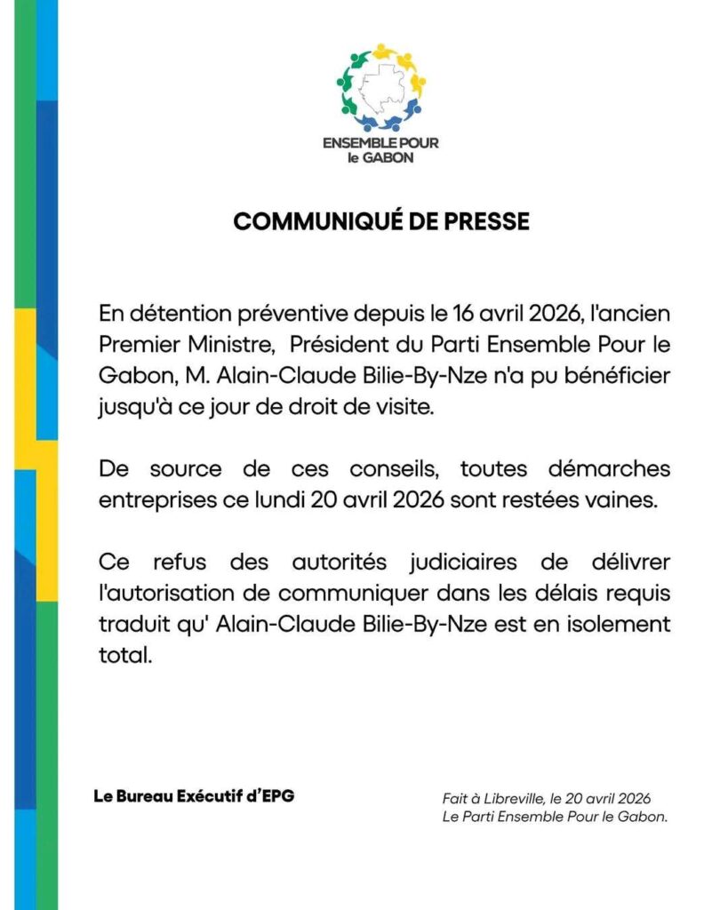 Le communiqué publié par le parti Ensemble Pour le Gabon (EPG), faisant état d’un prétendu isolement et d’un refus de droit de visite à l’égard de l’ancien Premier ministre Alain-Claude Billie-By-Nzé, suscite une vive controverse dans les sphères judiciaires et médiatiques gabonaises. Des sources judiciaires et pénitentiaires contactées par la presse judiciaire gabonaise apportent un démenti formel, rétablissant les règles procédurales en vigueur et les faits observés sur le terrain.