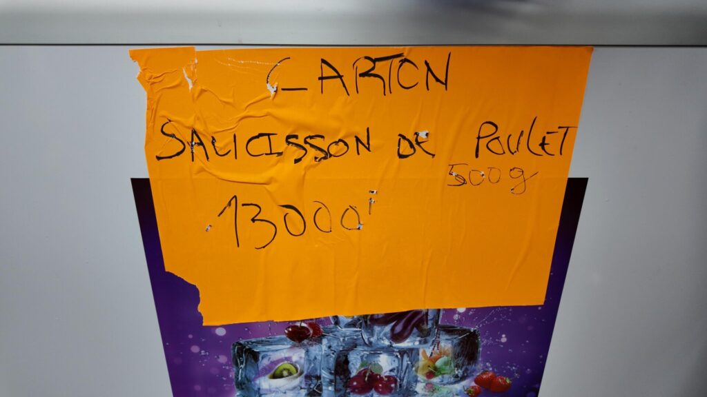 Les petits pois, petits pois carottes et macédoine (400 g) tombent de 650 F à 450 F. En format 800 g, ces mêmes produits reculent de 1 300 F à 900 F, soit une économie de 400 F par unité.Boucherie et charcuterieLes cuisses de poulet (10 kg) passent de 11 000 F à 9 900 F, les ailes de poulet (10 kg) de 11 500 F à 10 500 F, et les rognons de bœuf (10 kg) de 11 500 F à 9 900 F. Le cotis de porc (10 kg) enregistre la baisse la plus forte, passant de 16 500 F à 14 500 F, soit 2 000 F d’économie. Le saucisson de poulet (500 g) est quant à lui proposé à 650 F.