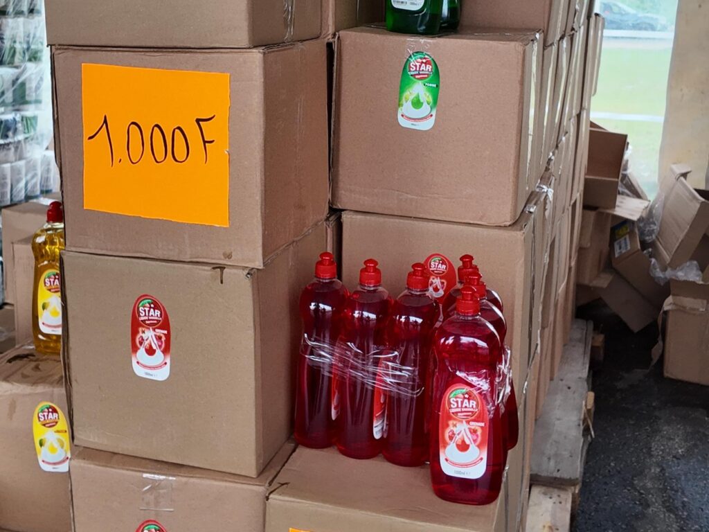 Le rayon entretien n’est pas en reste. L’eau de Javel (1 litre) passe de 1 000 F à 690 F, et la version 5 litres de 2 200 F à 1 600 F. Le liquide vaisselle (1 litre) descend de 900 F à 650 F, et le format 5 litres chute de 4 950 F à 3 750 F. Le papier toilette (4 rouleaux) passe de 1 250 F à 900 F. Le savon en poudre (500 g) recule de 650 F à 490 F, le format 1 kg de 1 350 F à 990 F, et le savon en morceaux (200 g) de 250 F à 190 F.