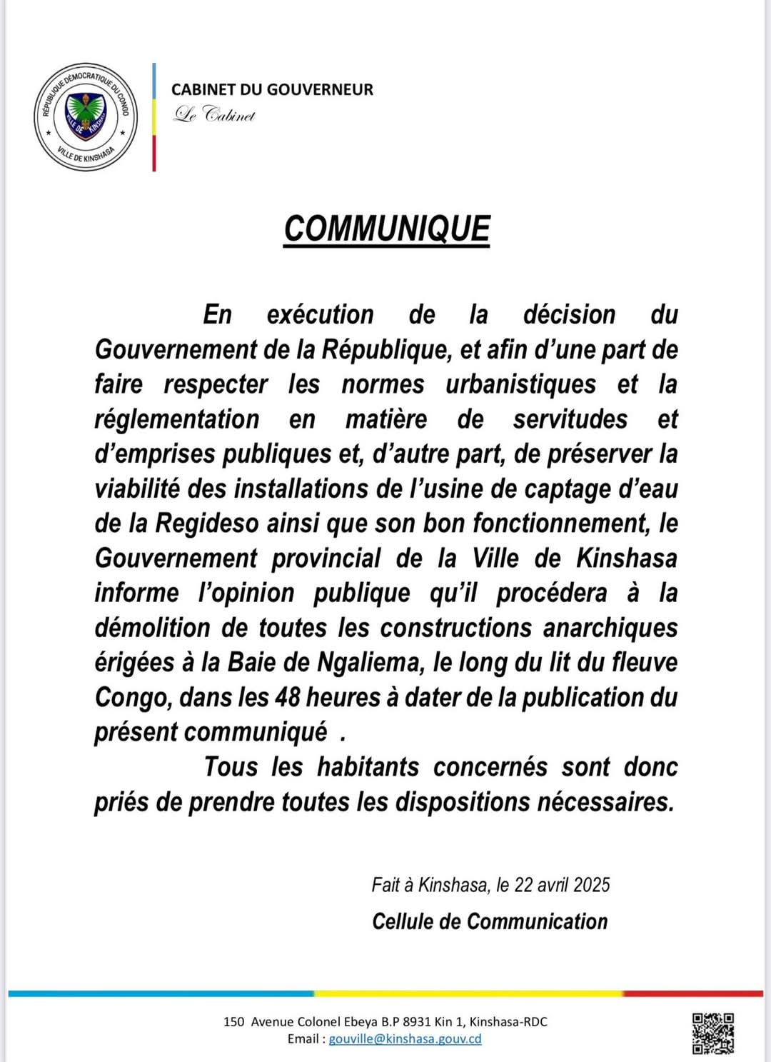Dans une décision qui suscite déjà un vaste écho dans l’opinion publique, le Gouvernement provincial de la ville de Kinshasa vient de frapper un grand coup contre l’urbanisation sauvage. Dans un communiqué officiel publié ce mardi 22 avril 2025, la Cellule de Communication du Gouvernorat annonce la démolition, dans un délai de 48 heures, de… Poursuivre la lecture Kinshasa : démolition immédiate à la Baie de Ngaliema !