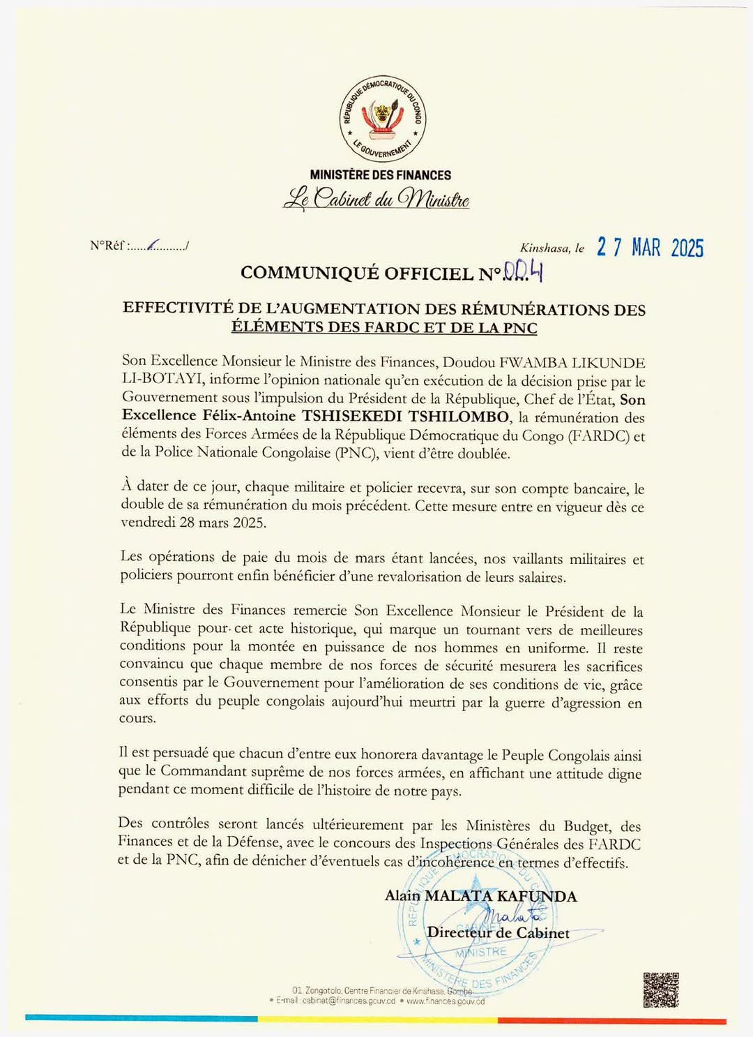 Kinshasa, 27 mars 2025 – C’est une annonce qui fera date dans l’histoire des forces de sécurité congolaises. Par un communiqué officiel du ministère des Finances, le gouvernement de la République démocratique du Congo (RDC) a annoncé le doublement des rémunérations des éléments des Forces Armées de la République Démocratique du Congo (FARDC) et de… Poursuivre la lecture RDC : Hausse historique des salaires des FARDC et de la PNC